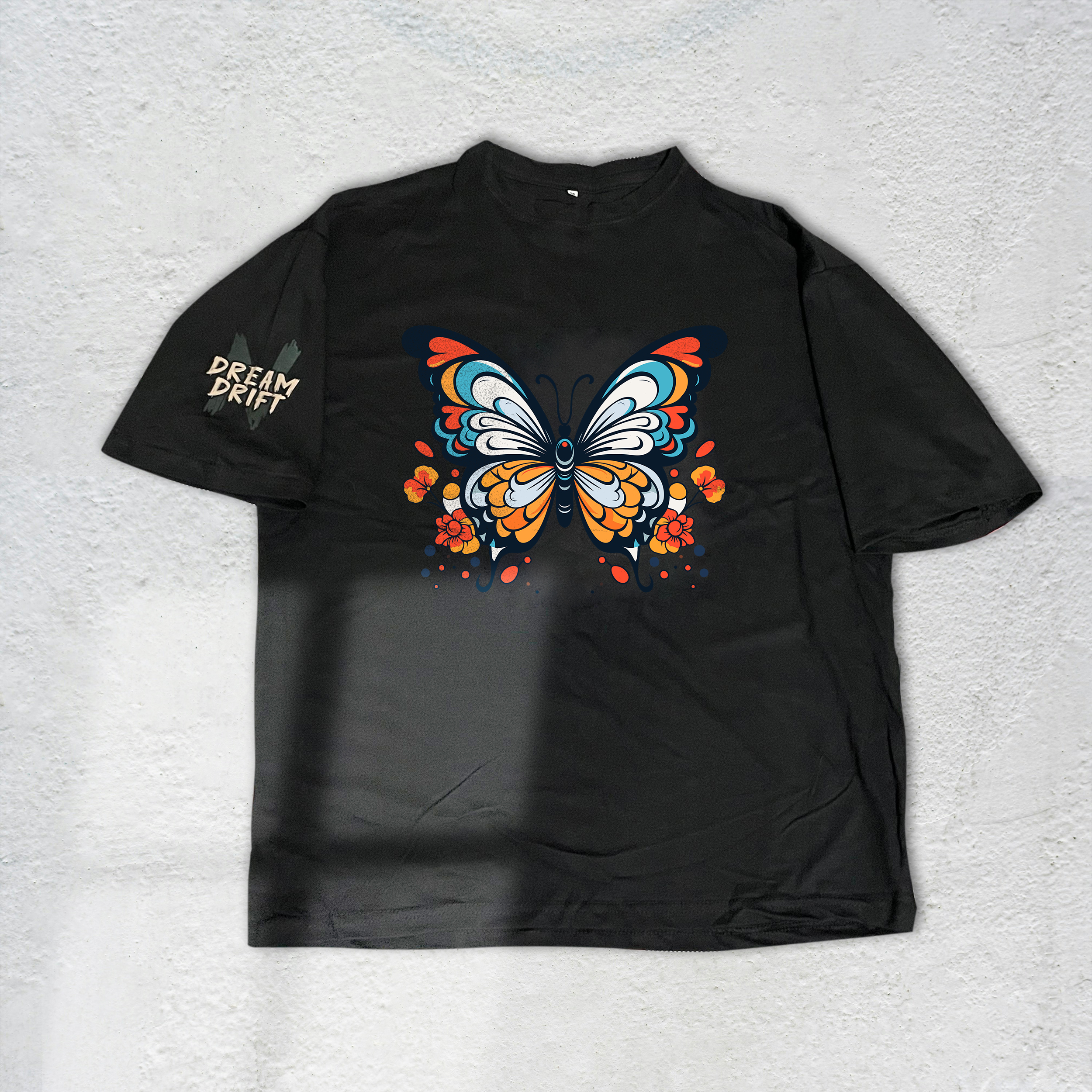Embrace elegance and vibrancy with the Butterfly Bloom graphic tee from Dreamndrift. Showcasing a mesmerizing butterfly design, adorned with intricate orange and blue hues and surrounded by delicate floral accents, this black oversized t-shirt celebrates the beauty of growth and transformation. The bold yet graceful design is complemented by the “Dream Drift” logo on the sleeve, making it a statement piece for fans of artistic streetwear. Crafted from a premium cotton-polyester blend, this tee offers unmatched comfort and style, perfect for everyday wear or expressing your creative flair.