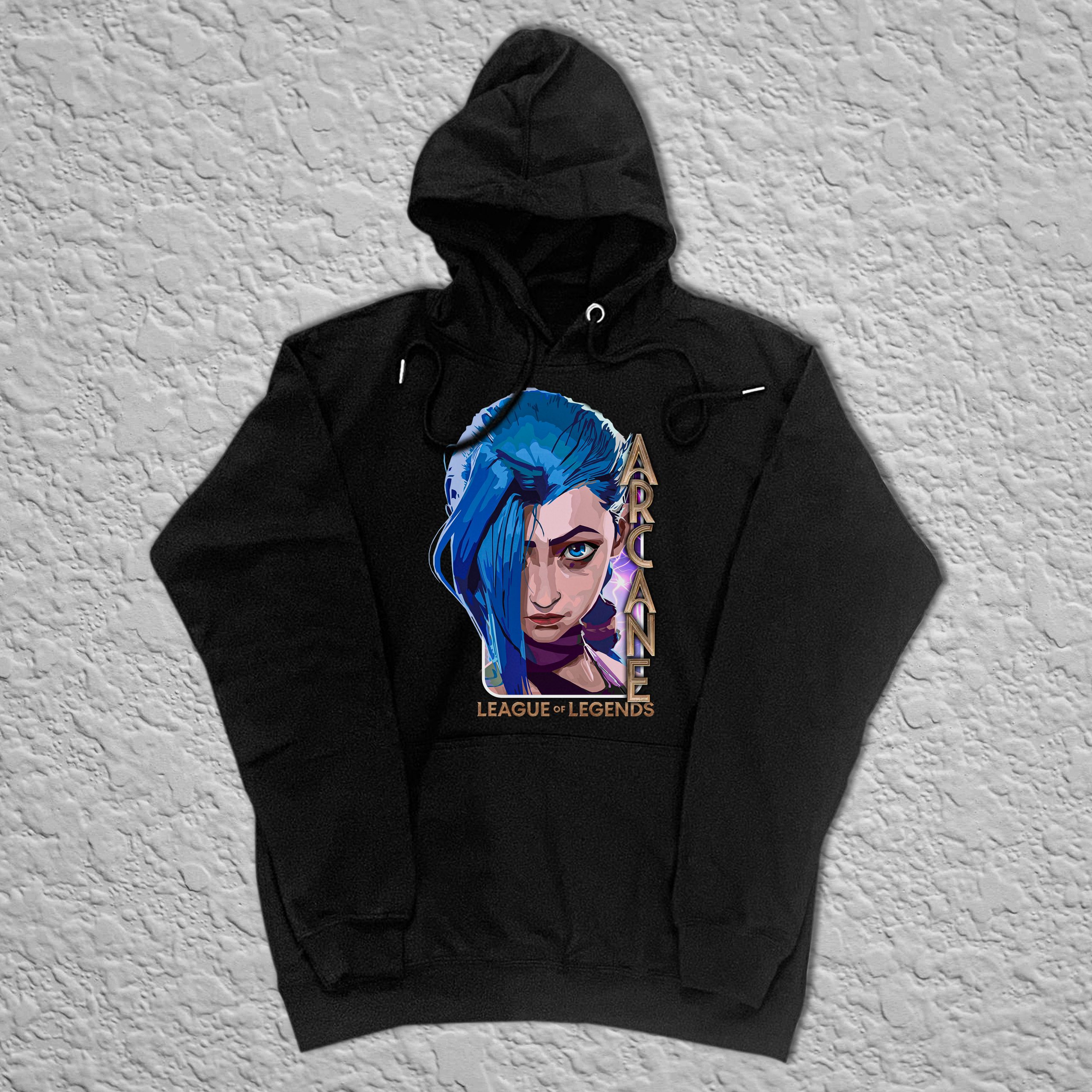 Celebrate the chaos and charisma of Jinx with this stunning Dreamndrift hoodie, inspired by Arcane: League of Legends. Featuring a bold, high-resolution design of Jinx’s signature intense gaze and electric blue hair, this hoodie is a must-have for fans of the ground breaking series. The vertical “Arcane” lettering and rich graphic details add depth and dimension, making this piece a wearable work of art.