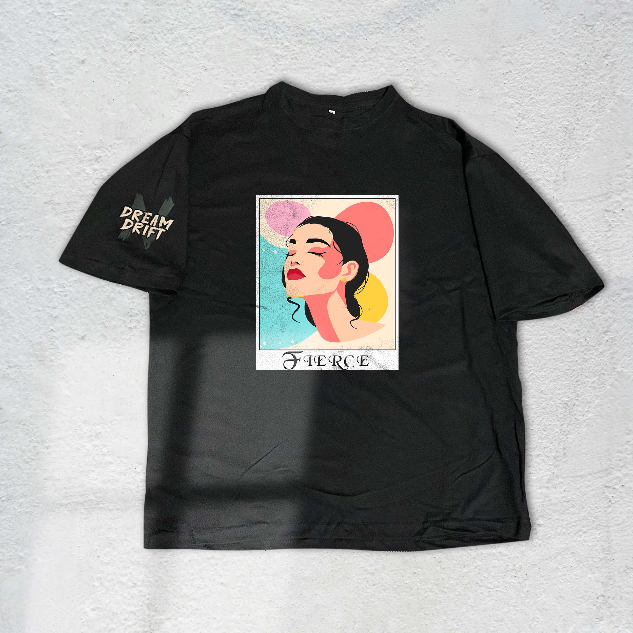 Command attention and exude confidence with the Fierce Muse graphic tee from Dreamndrift. This oversized black t-shirt features a bold, artful depiction of a woman embracing her power, surrounded by soft pastel shapes that add a touch of dreamy surrealism. The word “FIERCE” is elegantly displayed below the artwork, embodying the strength and individuality that defines Dreamndrift’s spirit.
